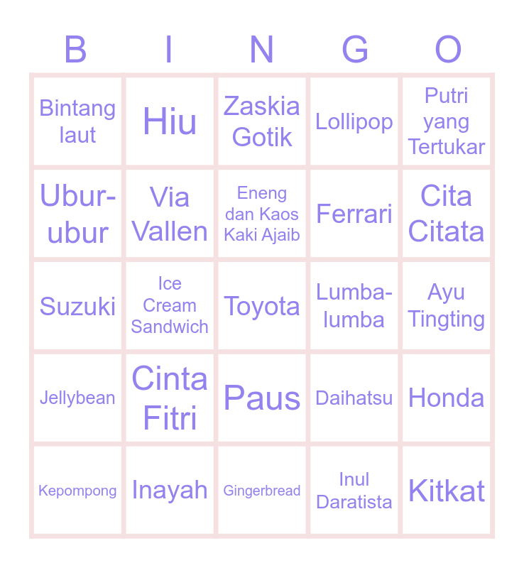This bingo card has a free space and 24 words: Cinta Fitri, Inayah, Eneng dan Kaos Kaki Ajaib, Kepompong, Putri yang Tertukar, Bintang laut, Ubur-ubur, Hiu, Lumba-lumba, Paus, Ferrari, Suzuki, Daihatsu, Honda, Via Vallen, Inul Daratista, Ayu Tingting, Zaskia Gotik, Cita Citata, Ice Cream Sandwich, Kitkat, Jellybean, Lollipop and Gingerbread.