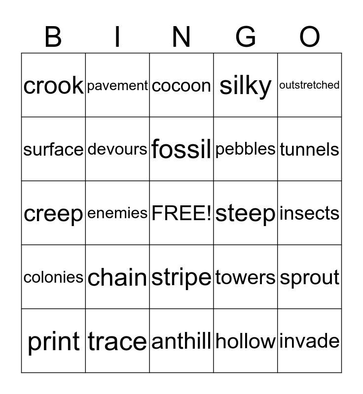 This bingo card has a free space and 24 words: chain, trace, fossil, print, outstretched, crook, surface, pavement, steep, stripe, pebbles, creep, towers, sprout, devours, hollow, insects, cocoon, tunnels, enemies, invade, colonies, silky and anthill.