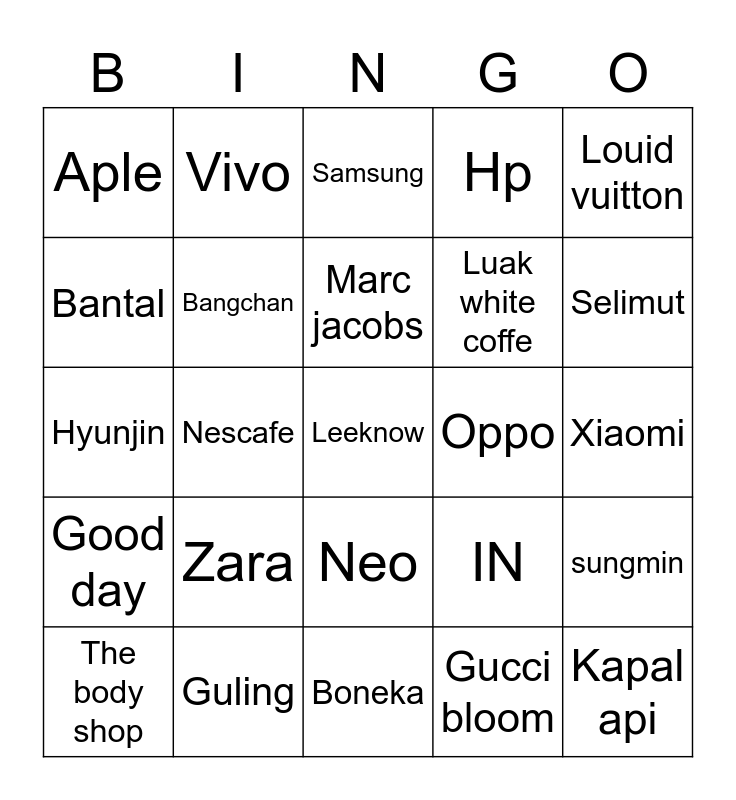 This bingo card has a free space and 24 words: The body shop, Zara, Marc jacobs, Gucci bloom, Louid vuitton, Aple, Vivo, Samsung, Oppo, Xiaomi, Hyunjin, Bangchan, IN, sungmin, Bantal, Guling, Boneka, Hp, Selimut, Good day, Nescafe, Neo, Luak white coffe and Kapal api.