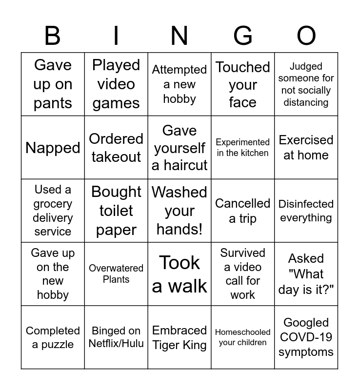 This bingo card has a free space and 24 words: Overwatered Plants, Binged on Netflix/Hulu, Gave yourself a haircut, Completed a puzzle, Judged someone for not socially distancing, Gave up on pants, Napped, Played video games, Cancelled a trip, Took a walk, Experimented in the kitchen, Used a grocery delivery service, Survived a video call for work, Asked "What day is it?", Ordered takeout, Homeschooled your children, Disinfected everything, Attempted a new hobby, Exercised at home, Bought toilet paper, Googled COVD-19 symptoms, Gave up on the new hobby, Touched your face and Embraced Tiger King.