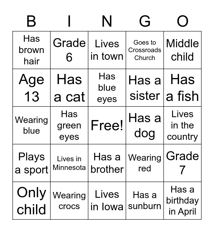 This bingo card has a free space and 25 words: Lives in Minnesota, Lives in Iowa, Has blue eyes, Only child, Middle child, Has brown hair, Age 13, Grade 6, Has a dog, Has a brother, Has a sister, Wearing blue, Wearing red, Grade 7, Has a cat, Wears glasses, Lives in the country, Lives in town, Has a fish, Has green eyes, Has a birthday in April, Wearing crocs, Plays a sport, Goes to Crossroads Church and Has a sunburn.