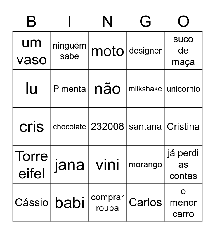 This bingo card has a free space and 29 words: Cássio, Peta, chocolate, Carlinhos, um vaso, moto, Pimenta, jana, santana, babi, Cristina, o menor carro, comprar roupa, Carlos, unicornio, viajem, vini, Torre eifel, suco de maça, cris, morango, Cláudio, milkshake, lu, designer, ninguém sabe, já perdi as contas, não and sim.