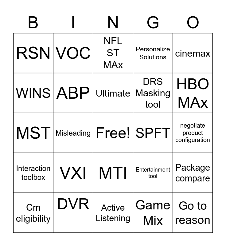 This bingo card has a free space and 24 words: VXI, DVR, Ultimate, Cm eligibility, cinemax, RSN, WINS, VOC, SPFT, MTI, DRS Masking tool, MST, Entertainment tool, Package compare, ABP, Game Mix, negotiate product configuration, NFL ST MAx, HBO MAx, Misleading, Go to reason, Interaction toolbox, Personalize Solutions and Active Listening.