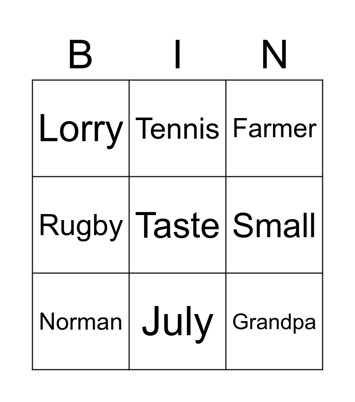 This bingo card has a free space and 29 words: Eyes, See, Car, Football, Lorry, Farmer, Norman, Apple, Smell, Ears, Mouth, Chocolate, Touch, Hands, Cheese, Pasta, Book, Game, Grandpa, T-shirt, Socks, Long, Big, Small, Rugby, Tennis, Team, July and Blue clue.