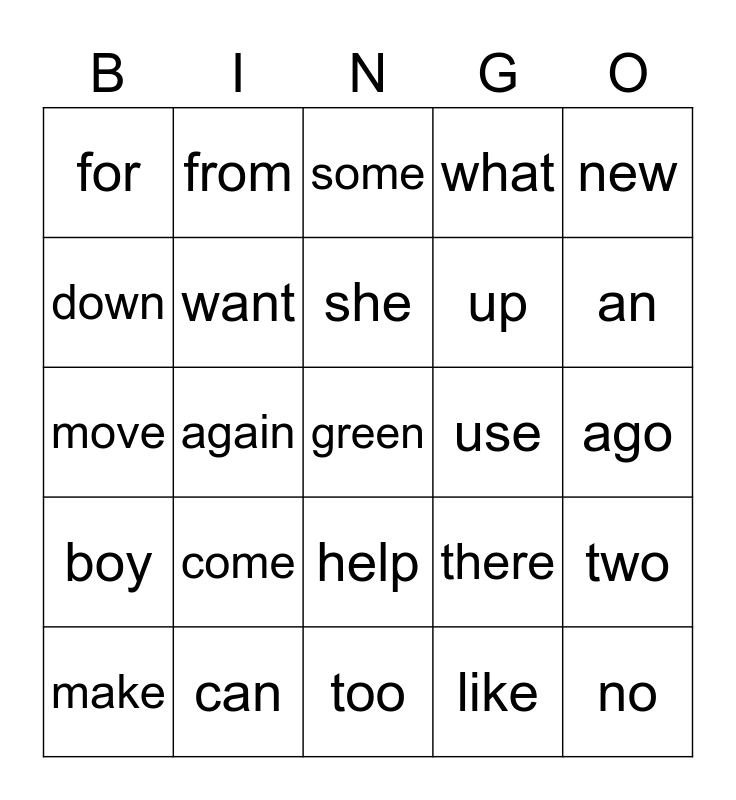 This bingo card has 95 words: Free!, I, like, do, to, you, he, can, go, a, has, are, me, she, with, for, an, have, see, said, was, does, not, school, what, down, out, up, very, be, come, good, pull, fun, make, they, too, jump, move, run, two, again, help, new, there, use, could, live, one, then, three, eat, no, of, under, who, all, early, day, her, want, around, by, many, place, walk, away, now, some, today, way, why, green, grow, pretty, should, together, water, any, from, happy, once, so, upon, ago, boy, girl, how, old, people, after, done, every, soon and work.