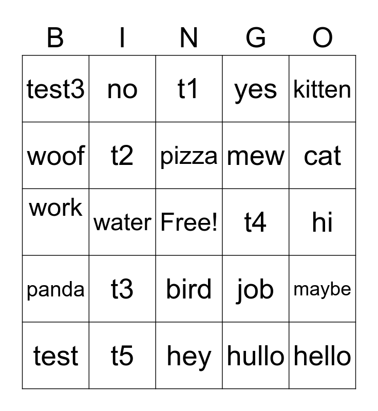 This bingo card has a free space and 29 words: test, food, water, test2, test3, t1, t2, t3, t4, t5, hi, hello, hey, hullo, cat, dog, bird, panda, kitten, work, job, trabajo, mew, woof, yes, no, maybe, pizza and pie.