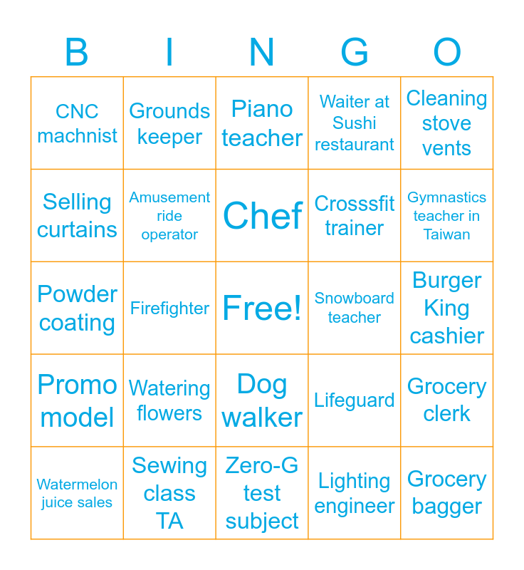 This bingo card has a free space and 32 words: Lighting engineer, Build furniture, Firefighter, Landscaper, Promo model, Amusement ride operator, Cleaning stove vents, Grocery clerk, Grounds keeper, Physics teacher, Chef, Piano teacher, Ride attendant, Car wash, Snowboard teacher, KFC / A&W, Watermelon juice sales, Powder coating, Dog walker, Watering flowers, Lifeguard, Sorting nuts & bolts, Burger King cashier, Sewing class TA, Grocery bagger, Waiter at Sushi restaurant, Crosssfit trainer, Selling curtains, CNC machnist, Zero-G test subject, Coffee house and Gymnastics teacher in Taiwan.