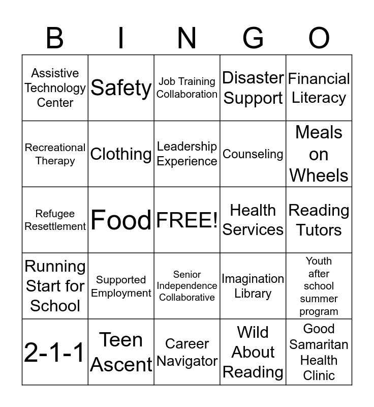 This bingo card has a free space and 56 words: 0-6 School Preparedness, 2-1-1, Advocate, Assistive Technology Center, Career Navigator, Childcare, Clothing, Community Gang Initiative, Counseling, Crisis Nursery, Disaster Support, Donated goods, Employment, Families Matter, Family Access Center, Family Stabilizer, Financial Literacy, Food, Give, Good Samaritan Health Clinic, Health Services, Housing/Shelter, Imagination Library, Job Training Collaboration, LEAD Mentorship, Leadership Experience, Legal Services, Live United, Meals on Wheels, Olmsted Happy Teeth, Olmsted Outdoors, Power of the Purse, Project Restore, Rapid Access Clinic, Reading Tutors, Recreational Therapy, Refugee Resettlement, Rent Assistance, Running Start for School, Safety, Senior Independence Collaborative, Silver Creek Corner, Sports Mentorship Academy, Stability, Student and Family Engagement (SAFE), Supported Employment, Teen Ascent, Transportation, United Way, Volunteering, Wild About Reading, Winter Outerwear Drive, Women’s Leadership Council, Y Mentors, Youth after school summer program and Youth Services.