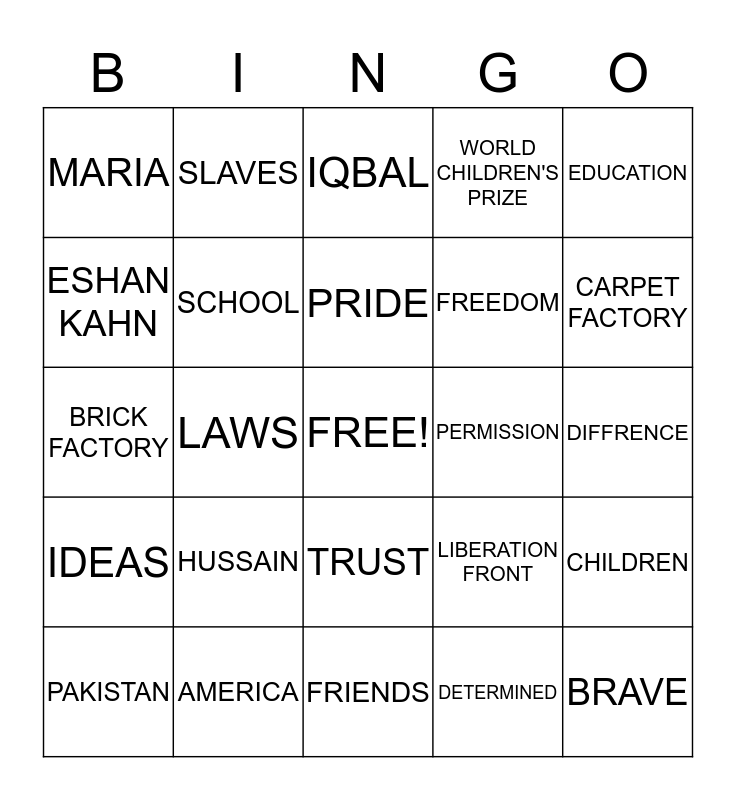 This bingo card has a free space and 24 words: HUSSAIN, AMERICA, PRIDE, PAKISTAN, EDUCATION, MARIA, ESHAN KAHN, SLAVES, PERMISSION, TRUST, FREEDOM, BRICK FACTORY, LIBERATION FRONT, CHILDREN, SCHOOL, DETERMINED, DIFFRENCE, IQBAL, CARPET FACTORY, LAWS, BRAVE, IDEAS, WORLD CHILDREN'S PRIZE and FRIENDS.