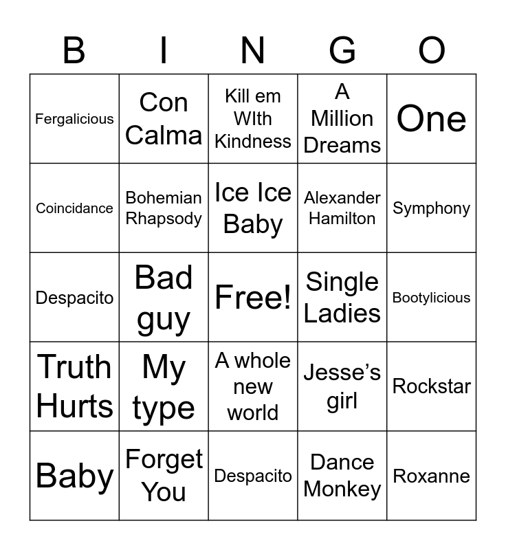 This bingo card has a free space and 40 words: Sunday Best, Despacito, Party in the USA, Bohemian Rhapsody, Forget You, A whole new world, Ice Ice Baby, Say so, One, Truth Hurts, Bad guy, A Million Dreams, Roxanne, Bootylicious, Single Ladies, My type, The Duck Song, Fergalicious, Mamma Mia, Kill em WIth Kindness, Rockstar, Dance Monkey, Alexander Hamilton, Coincidance, Chandelier, How far I’ll go, Africa, Crazy In Love, Dancing Queen, Respect, Wolves, Baby, Don’t Stop Me Know, Jesse’s girl, Symphony, Despacito, Call Me Maybe, Before you go, Con Calma and Lip Gloss.