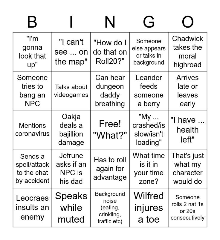 This bingo card has a free space and 24 words: Leocraes insults an enemy, Jefrune asks if an NPC is his dad, Can hear dungeon daddy breathing, Wilfred injures a toe, Chadwick takes the moral highroad, "I'm gonna look that up", "I can't see ... on the map", "How do I do that on Roll20?", "My ... crashed/is slow/isn't loading", "I have ... health left", Mentions coronavirus, Talks about videogames, What time is it in your time zone?, That's just what my character would do, Someone tries to bang an NPC, Speaks while muted, Background noise (eating, crinkling, traffic etc), Someone else appears or talks in background, Arrives late or leaves early, Sends a spell/attack to the chat by accident, Oakja deals a bajillion damage, Has to roll again for advantage, Leander feeds someone a berry and Someone rolls 2 nat 1s or 20s consecutively.
