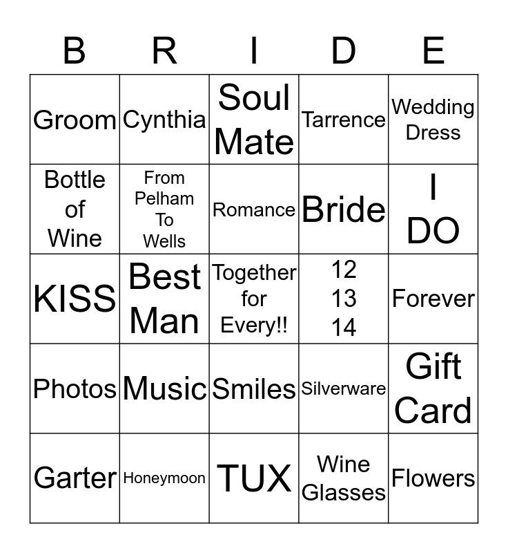 This bingo card has a free space and 24 words: Music, Honeymoon, Romance, Garter, Wedding Dress, Groom, Bottle of Wine, Cynthia, 12 13 14, Smiles, Bride, KISS, Silverware, Gift Card, From Pelham To Wells, Wine Glasses, Forever, Soul Mate, I DO, Best Man, Flowers, Photos, Tarrence and TUX.