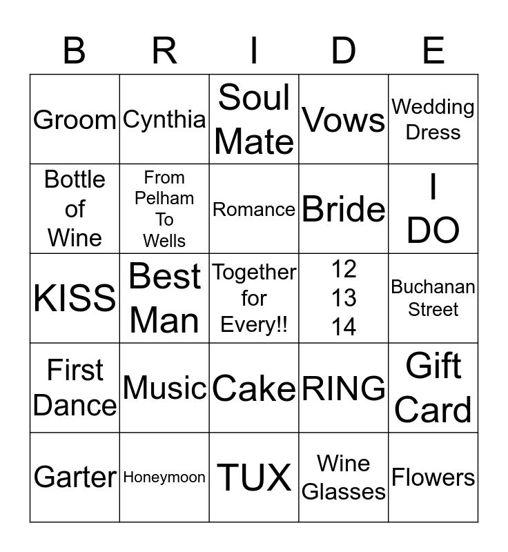 This bingo card has a free space and 24 words: Music, Honeymoon, Romance, Garter, Wedding Dress, Groom, Bottle of Wine, Cynthia, 12 13 14, Cake, Bride, KISS, RING, Gift Card, From Pelham To Wells, Wine Glasses, Buchanan Street, Soul Mate, I DO, Best Man, Flowers, First Dance, Vows and TUX.