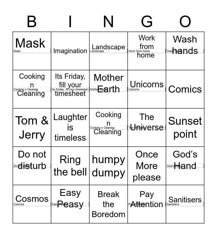 This bingo card has 24 images, a free space and 61 words: U There?, Easy Peasy, Let's talk, Do not disturb, Pay Attention, Okie Dokie, Its Friday, fill your timesheet, Sizzling sizzler, Unicorns, Happy Weekend, Work from home, Virtual fun Friday, Cooking n Cleaning, Team connect, Stay Home, Mask, Sanitisers, Wash hands, Netflix n Prime, Mother Earth, The Universe, Landscape, Cosmos, God’s Hand, God’s Hand, Beast, Beauty, Animation, Comics, Cartoon, Accomplish, Action, Lockdown, Believe, Imagination, Serial chiller, Everything is Practice, Laughter is timeless, Wonderlust, Tom & Jerry, Thrive and Strive, Ring the bell, Sunset point, Heaven’s Gate, Once More please, Tweaky treat, Stop and Run, Tea Time, seven starts, humpy dumpy, Break the Boredom, Can u hear me?, I am sharing my screen, There is a lag, Will get back to you, Good job, Teams, Outlook, Skype, Legacy and Inclusion.