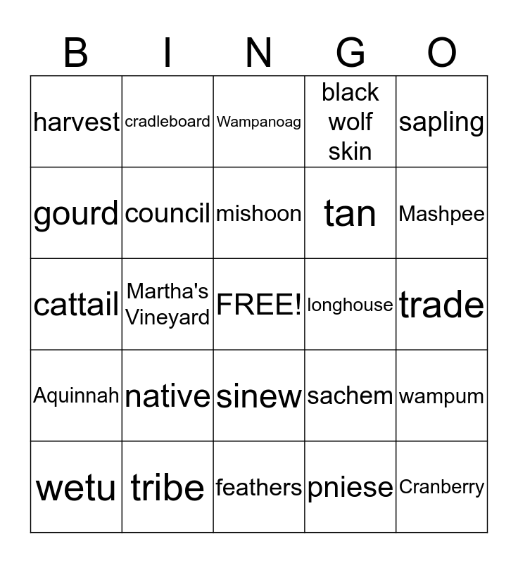 This bingo card has a free space and 24 words: native, tribe, mishoon, wetu, sapling, harvest, gourd, cradleboard, longhouse, sinew, tan, cattail, sachem, wampum, council, pniese, trade, Wampanoag, Mashpee, Martha's Vineyard, Cranberry, Aquinnah, black wolf skin and feathers.