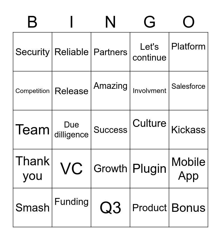 This bingo card has a free space and 24 words: VC, Funding, Amazing, Smash, Platform, Security, Competition, Reliable, Culture, Growth, Involvment, Team, Plugin, Mobile App, Release, Product, Kickass, Partners, Salesforce, Due dilligence, Bonus, Thank you, Let's continue and Q3.