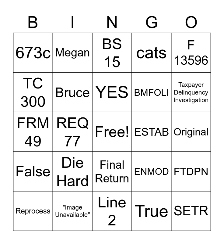 This bingo card has a free space and 47 words: ASED, SETR, IAT Tool, Line 2, Die Hard, 017, Megan, Exam, TC 300, 6020(b), Bruce, cats, FTDPN, ENMOD, TC 610, TC 650, YES, ESTAB, Green, F 13596, REQ 77, True, 673c, BMFOLI, 02 or 03, Taxpayer Delinquency Investigation, Reprocess, ENREQ, Final Return, False, BS 00, True Duplicate, TXMOD, Item Reference Number, DUPF, "Image Unavailable", Original, Amended, Refund, AMS, TC 290 for .00, BS 15, FRM 49, REQ 54, -A freeze, CP 193 and TC 976.