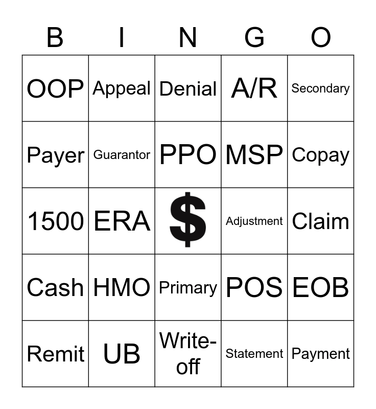 This bingo card has a free space and 27 words: POS, Authorization, MSP, Write-off, Payer, Denial, Appeal, Cash, Adjustment, EOB, 1500, A/R, Remit, UB, Copay, E/M, Guarantor, PPO, HMO, OOP, Claim, Statement, ERA, Payment, Primary, Secondary and ABN.