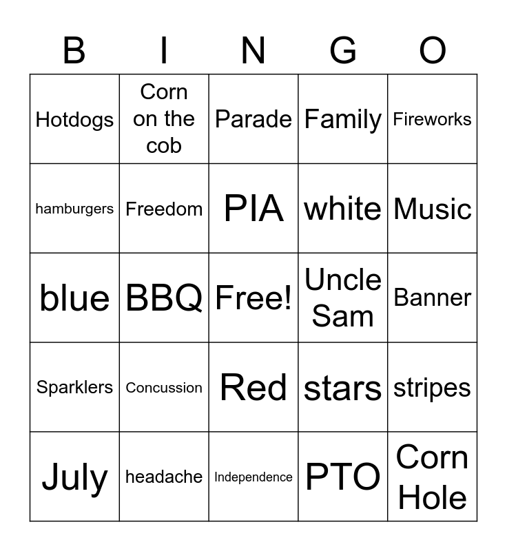 This bingo card has a free space and 24 words: Concussion, headache, PIA, July, Fireworks, Hotdogs, hamburgers, Corn on the cob, Uncle Sam, Red, white, blue, stars, stripes, Freedom, PTO, Banner, Parade, Music, BBQ, Corn Hole, Sparklers, Family and Independence.