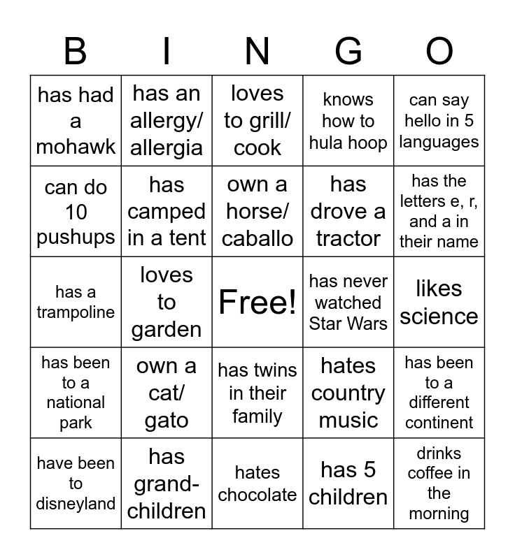 This bingo card has a free space and 24 words: own a cat/ gato, has grand-children, own a horse/ caballo, have been to disneyland, can say hello in 5 languages, has had a mohawk, can do 10 pushups, has an allergy/ allergia, has never watched Star Wars, has twins in their family, has drove a tractor, has a trampoline, hates country music, has been to a different continent, has camped in a tent, has 5 children, likes science, loves to grill/ cook, has the letters e, r, and a in their name, loves to garden, drinks coffee in the morning, has been to a national park, knows how to hula hoop and hates chocolate.