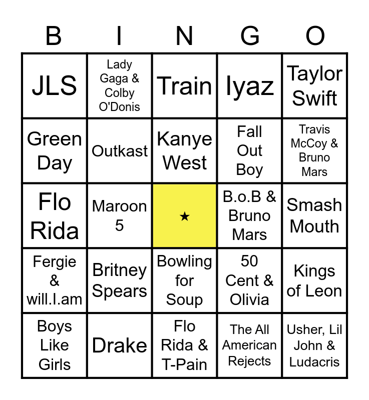 This bingo card has a free space and 34 words: Missy Elliott, The All American Rejects, Justin Timberlake feat. Timbaland, Black Eyed Peas, Fergie & will.I.am, Outkast, Taylor Swift, Boys Like Girls, Lady Gaga & Colby O'Donis, Jason Mraz, Kanye West, Train, Ke$ha, Eminem, B.o.B & Bruno Mars, Travis McCoy & Bruno Mars, Drake, Flo Rida, Britney Spears, 50 Cent & Olivia, Bowling for Soup, Nelly Furtado & Timbaland, JLS, Smash Mouth, Flo Rida & T-Pain, Usher, Lil John & Ludacris, Iyaz, Gwen Stefani & Akon, Fall Out Boy, Green Day, Vanessa Carlton, Maroon 5, Kings of Leon and Atomic Kitten.