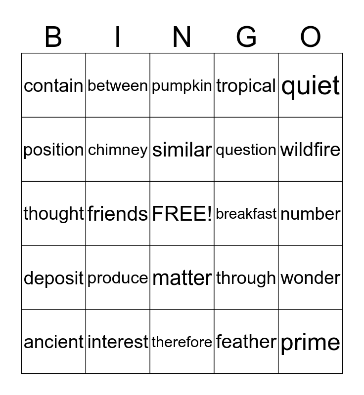This bingo card has a free space and 24 words: produce, interest, similar, ancient, quiet, contain, position, between, breakfast, matter, question, thought, through, wonder, chimney, feather, number, pumpkin, wildfire, friends, prime, deposit, tropical and therefore.
