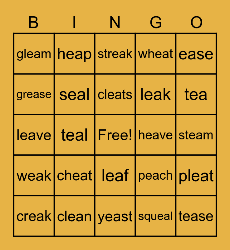 This bingo card has a free space and 24 words: cheat, clean, cleats, creak, ease, gleam, grease, heap, heave, leaf, leak, leave, peach, pleat, seal, squeal, steam, streak, tea, teal, tease, weak, wheat and yeast.