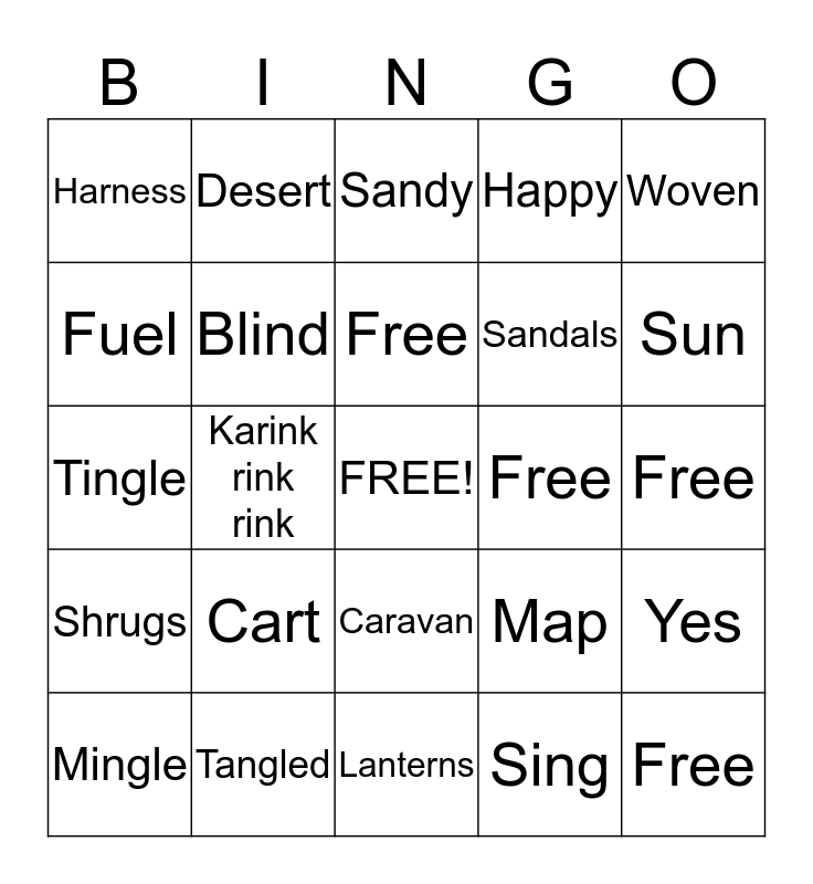 This bingo card has a free space and 24 words: Cart, Tangled, Free, Mingle, Woven, Harness, Fuel, Desert, Free, Caravan, Sandals, Tingle, Map, Yes, Blind, Sing, Free, Sandy, Sun, Karink rink rink, Free, Shrugs, Happy and Lanterns.