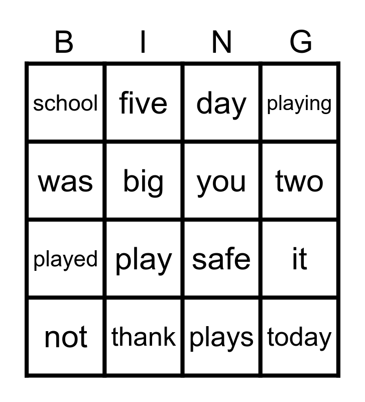 This bingo card has 20 words: not, too, day, it, an, play, plays, playing, played, five, safe, two, school, thank, you, will, was, big, came and today.
