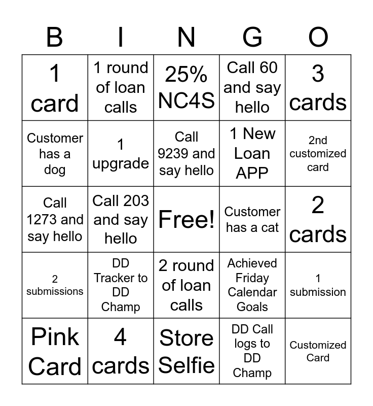 This bingo card has a free space and 24 words: Pink Card, DD Tracker to DD Champ, Call 9239 and say hello, DD Call logs to DD Champ, 3 cards, 1 card, 1 round of loan calls, 25% NC4S, Customer has a cat, 2 cards, Call 1273 and say hello, 1 upgrade, Achieved Friday Calendar Goals, 1 submission, Customer has a dog, 4 cards, Store Selfie, Call 60 and say hello, 2nd customized card, 2 submissions, Call 203 and say hello, 2 round of loan calls, 1 New Loan APP and Customized Card.