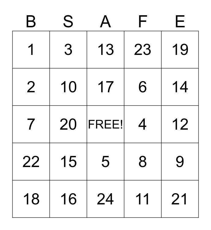 This bingo card has a free space and 24 words: 15, 16, 17, 18, 19, 1, 2, 3, 4, 5, 6, 7, 8, 9, 10, 11, 12, 13, 14, 20, 21, 22, 23 and 24.