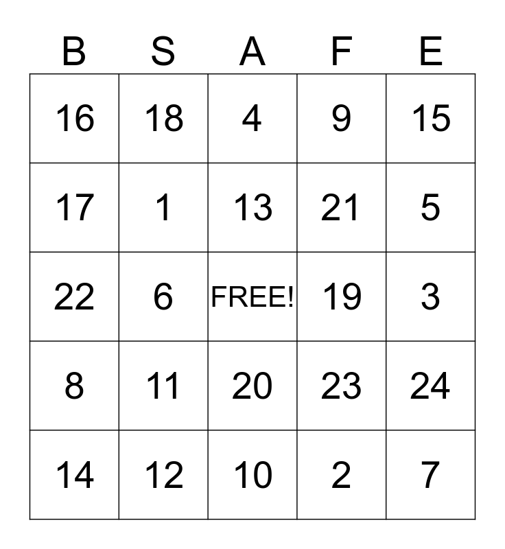 This bingo card has a free space and 24 words: 11, 12, 13, 14, 15, 16, 17, 18, 19, 20, 21, 22, 23, 24, 1, 2, 3, 4, 5, 6, 7, 8, 9 and 10.