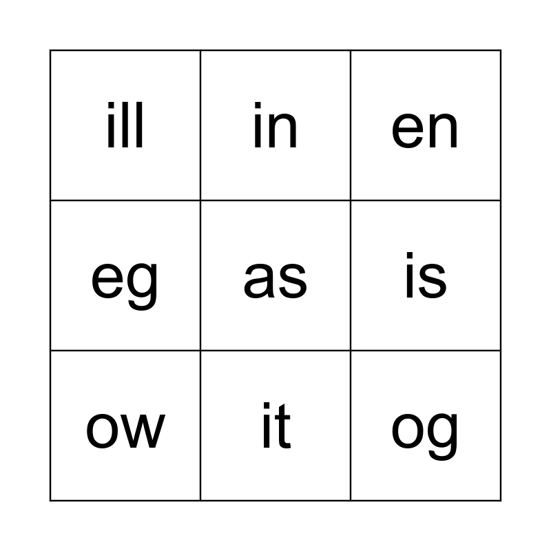 This bingo card has 24 words: ip, all, it, at, as, ill, is, in, an, on, og, ot, op, ar, ow, un, ug, en, et, ed, em, ell, eg and ub.