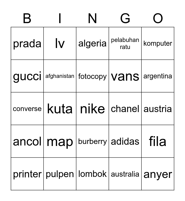 This bingo card has a free space and 24 words: map, pulpen, fotocopy, printer, komputer, prada, gucci, lv, chanel, burberry, vans, converse, adidas, fila, afghanistan, australia, austria, algeria, argentina, kuta, anyer, ancol, pelabuhan ratu and lombok.