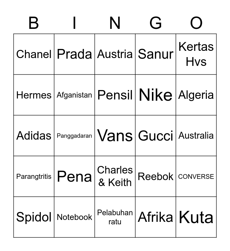 This bingo card has a free space and 24 words: Pena, Notebook, Pensil, Spidol, Kertas Hvs, Chanel, Hermes, Prada, Gucci, Charles & Keith, Nike, Adidas, Reebok, CONVERSE, Afganistan, Afrika, Australia, Austria, Algeria, Panggadaran, Kuta, Parangtritis, Sanur and Pelabuhan ratu.