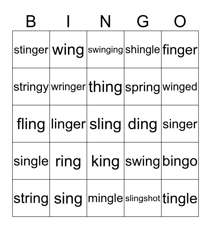 This bingo card has a free space and 24 words: ring, sing, thing, string, finger, stinger, stringy, wing, ding, king, spring, fling, swing, bingo, wringer, slingshot, singer, swinging, winged, linger, tingle, single, shingle and mingle.