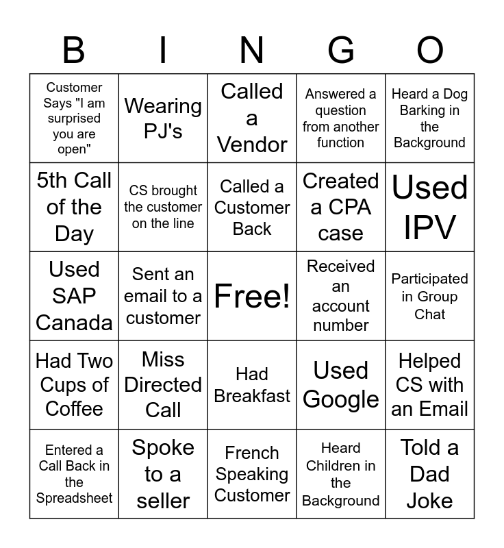 This bingo card has a free space and 25 words: Miss Directed Call, French Speaking Customer, Called a Customer Back, Entered a Call Back in the Spreadsheet, Heard a Dog Barking in the Background, Customer Says "I am surprised you are open", 5th Call of the Day, Wearing PJ's, Received an account number, Had Breakfast, Created a CPA case, Used SAP Canada, Used Google, Helped CS with an Email, CS brought the customer on the line, Had a Snack, Participated in Group Chat, Called a Vendor, Used IPV, Sent an email to a customer, Told a Dad Joke, Spoke to a seller, Had Two Cups of Coffee, Answered a question from another function and Heard Children in the Background.