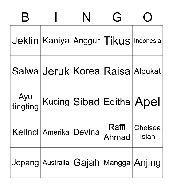 This bingo card has a free space and 24 words: Amerika, Australia, Korea, Jepang, Indonesia, Jeklin, Salwa, Kaniya, Editha, Devina, Raisa, Ayu tingting, Raffi Ahmad, Chelsea Islan, Jeruk, Mangga, Apel, Anggur, Alpukat, Kucing, Anjing, Kelinci, Tikus and Gajah.