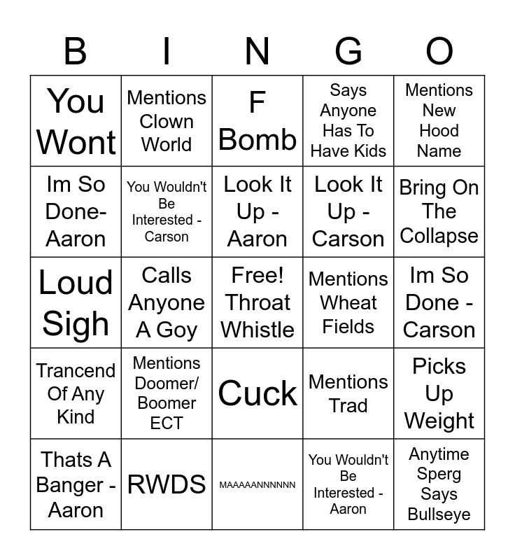 This bingo card has a free space and 24 words: Thats A Banger - Aaron, Mentions Doomer/ Boomer ECT, Look It Up - Aaron, You Wouldn't Be Interested - Aaron, Mentions New Hood Name, You Wont, Mentions Clown World, F Bomb, Mentions Wheat Fields, Im So Done - Carson, Loud Sigh, You Wouldn't Be Interested - Carson, Mentions Trad, Picks Up Weight, Im So Done-Aaron, RWDS, MAAAAANNNNNN, Says Anyone Has To Have Kids, Bring On The Collapse, Trancend Of Any Kind, Calls Anyone A Goy, Cuck, Look It Up - Carson and Anytime Sperg Says Bullseye.