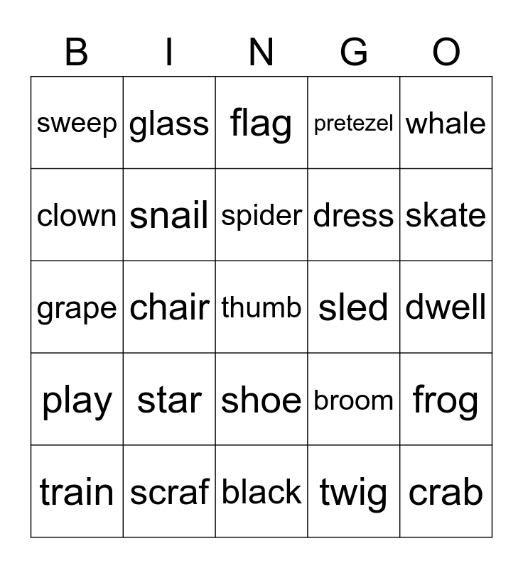 This bingo card has 27 words: broom, crab, dress, black, clown, flag, glass, play, sled, frog, grape, pretezel, train, scraf, skate, smile, snail, spider, star, sweep, dwell, twig, chair, thumb, shoe, whale and that.