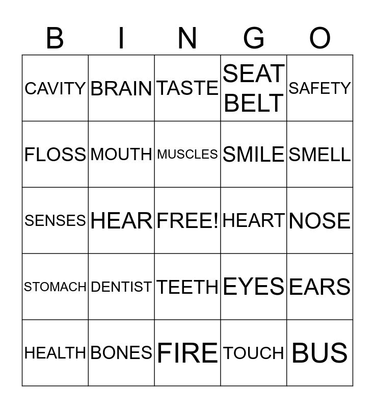 This bingo card has a free space and 24 words: DENTIST, BONES, MUSCLES, HEALTH, SAFETY, CAVITY, FLOSS, BRAIN, HEART, TEETH, SMILE, SENSES, EYES, EARS, MOUTH, TOUCH, NOSE, TASTE, SMELL, HEAR, BUS, STOMACH, SEAT BELT and FIRE.