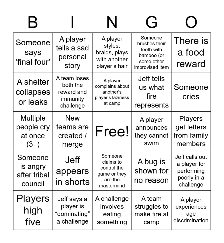 This bingo card has a free space and 28 words: Jeff calls out a player for performing poorly in a challenge, Someone gets hurt physically during (not during a challenge), Jeff tells us what fire represents, A team struggles to make fire at camp, A shelter collapses or leaks, A player styles, braids, plays with another player’s hair, A player tells a sad personal story, Someone is angry after tribal council, A player announces they cannot swim, Players high five, Multiple people cry at once (3+), Someone brushes their teeth with bamboo (or some other improvised item, Jeff says a player is “dominating” a challenge, A challenge involves eating something, Someone cries, A player hugs Jeff, Jeff appears in shorts, A team loses both the reward and immunity challenge, A player complains about another's player's laziness at camp, Someone claims to control the game or they are the mastermind, Someone says 'final four', Someone eats something gross, A player experiences age discrimination, New teams are created / merge, Players get letters from family members, A bug is shown for no reason, There is a food reward and Jeff tells us what fire represents.
