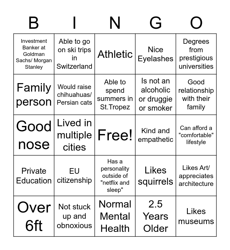 This bingo card has a free space and 24 words: Over 6ft, EU citizenship, Able to spend summers in St.Tropez, 2.5 Years Older, Degrees from prestigious universities, Investment Banker at Goldman Sachs/ Morgan Stanley, Able to go on ski trips in Switzerland, Athletic, Kind and empathetic, Can afford a "comfortable" lifestyle, Good nose, Would raise chihuahuas/ Persian cats, Likes squirrels, Likes Art/ appreciates architecture, Family person, Not stuck up and obnoxious, Normal Mental Health, Nice Eyelashes, Good relationship with their family, Private Education, Lived in multiple cities, Has a personality outside of "netflix and sleep", Is not an alcoholic or druggie or smoker and Likes museums.