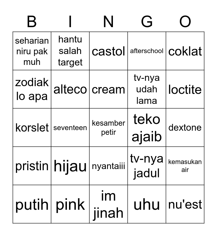 This bingo card has a free space and 24 words: hijau, pink, cream, putih, coklat, seharian niru pak muh, zodiak lo apa, hantu salah target, teko ajaib, nyantaiii, tv-nya udah lama, korslet, tv-nya jadul, kemasukan air, alteco, uhu, dextone, castol, loctite, seventeen, nu'est, pristin, afterschool and im jinah.