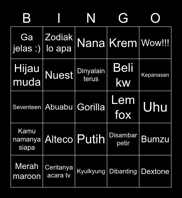 This bingo card has a free space and 24 words: Alteco, Ceritanya acara tv, Dinyalain terus, Merah maroon, Wow!!!, Ga jelas :), Hijau muda, Zodiak lo apa, Lem fox, Putih, Beli kw, Seventeen, Disambar petir, Bumzu, Nuest, Dibanting, Uhu, Nana, Kepanasan, Abuabu, Dextone, Kamu namanya siapa, Krem and Kyulkyung.