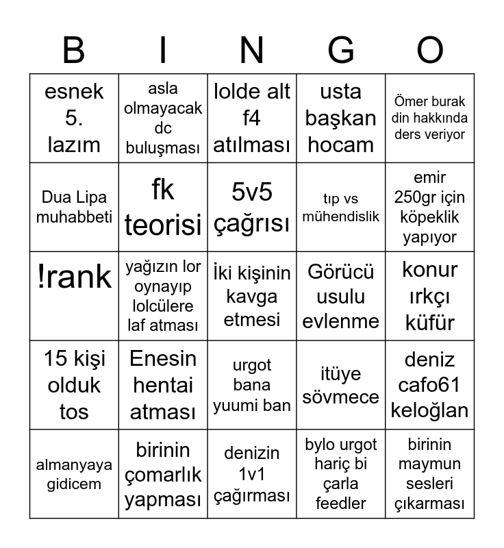 This bingo card has a free space and 24 words: Enesin hentai atması, birinin çomarlık yapması, 5v5 çağrısı, almanyaya gidicem, Ömer burak din hakkında ders veriyor, esnek 5. lazım, Dua Lipa muhabbeti, asla olmayacak dc buluşması, Görücü usulu evlenme, urgot bana yuumi ban, tıp vs mühendislik, !rank, itüye sövmece, deniz cafo61 keloğlan, fk teorisi, bylo urgot hariç bi çarla feedler, konur ırkçı küfür, lolde alt f4 atılması, emir 250gr için köpeklik yapıyor, yağızın lor oynayıp lolcülere laf atması, birinin maymun sesleri çıkarması, 15 kişi olduk tos, usta başkan hocam and denizin 1v1 çağırması.