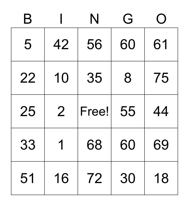 This bingo card has a free space and 24 words: 1, 16, 35, 51, 61, 5, 22, 42, 55, 68, 8, 25, 60, 69, 10, 30, 44, 56, 75, 2, 18, 33, 60 and 72.