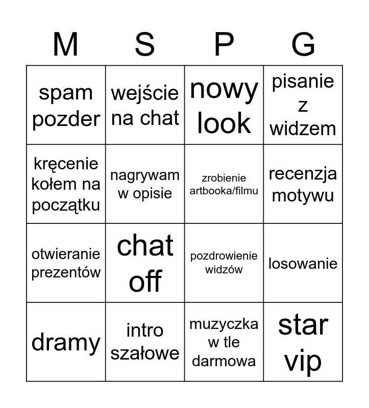 This bingo card has 16 words: intro szałowe, losowanie, nowy look, spam pozder, otwieranie prezentów, wejście na chat, pozdrowienie widzów, muzyczka w tle darmowa, kręcenie kołem na początku, nagrywam w opisie, dramy, pisanie z widzem, chat off, recenzja motywu, zrobienie artbooka/filmu and star vip.