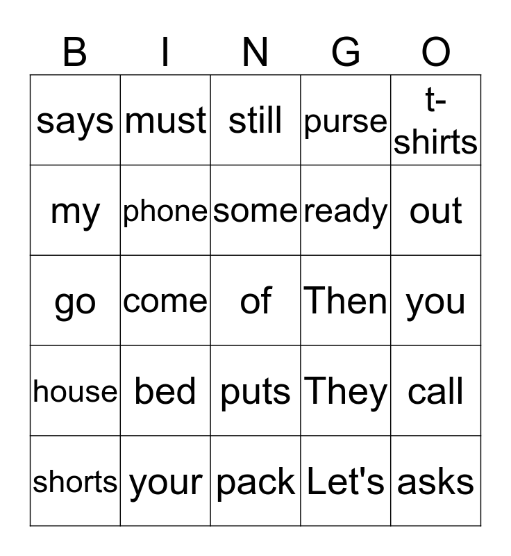 This bingo card has 25 words: bed, pack, some, shorts, t-shirts, says, my, must, Then, puts, ready, go, They, call, phone, asks, you, still, out, come, of, your, house, purse and Let's.