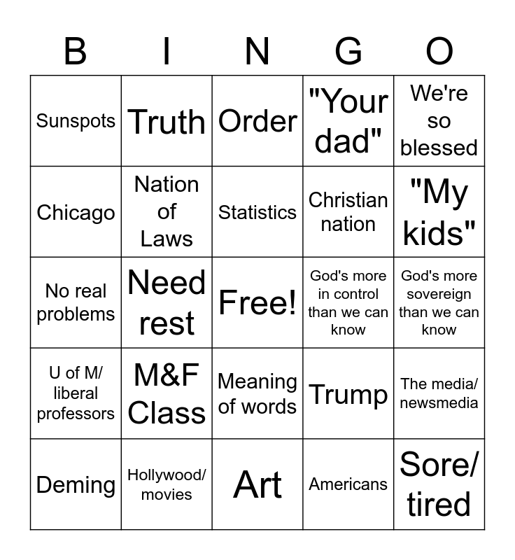 This bingo card has a free space and 24 words: Deming, M&F Class, Statistics, Americans, We're so blessed, Sunspots, Truth, Order, God's more in control than we can know, God's more sovereign than we can know, No real problems, Nation of Laws, Trump, The media/ newsmedia, Chicago, Hollywood/ movies, Art, "Your dad", "My kids", U of M/ liberal professors, Need rest, Meaning of words, Christian nation and Sore/ tired.